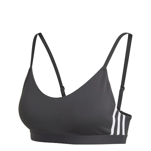 De adidas 3 Stripes Bra voor dames is een ondersteunende sport-BH. Het zeer zachte en rekbare materiaal voelt fijn aan op de huid en voert vocht goed af. De stof is gemaakt van gerecyclede materialen om grondstoffen te besparen en uitstoot te verminderen. De sport-BH geeft lichte ondersteuning, voor dames met een grote cupmaat is dit wellicht niet genoeg. Je trekt de sport-BH aan over je hoofd. De BH bevat uitneembare cups. De verstelbare schouderbandjes bieden een persoonlijke pasvorm.