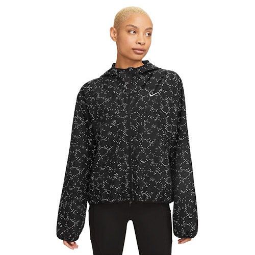 De Dri-FIT Jacket is een comfortabel hardloopjack met capuchon. Het jack is voorzien van een all-over reflecterende print die geïnspireerd op het sterrenstelsel. De Nike Dri-FIT technologie zorgt voor een goed ademend vermogen, een snellere verdamping en comfortabele pasvorm.