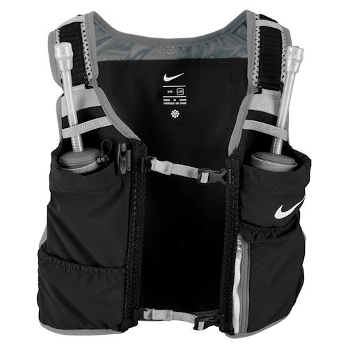 Het Nike Kiger Vest 4.0 is een lichtgewicht rugzak. Het materiaal is ademend en vormt zich precies naar je lichaam. De pasvorm is te verstellen en er zijn verschillende opbergmogelijkheden. Voorop zitten twee vakken voor twee 500ml waterflesjes (inclusief) en drie kleinere vakjes voor persoonlijke items. Ook vind je hier sleutelringen en een veiligheidsfluitje. Op de achterkant kun je een waterzak van 2 liter kwijt (niet inbegrepen) en hiernaast zijn er bevestigingsmogelijkheden voor lichtgewicht trail stokken.