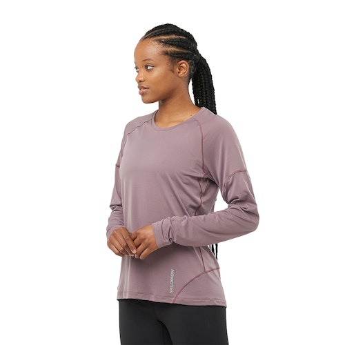 Artikelnummer: LC2130800 Artikelgroep: Shirts Pasvorm: Standaard Eigenschappen: Reflecterend Kleur: Paars Geslacht: Dames Merk: Salomon Materiaal: 59% Polyamide, 41% Polyester